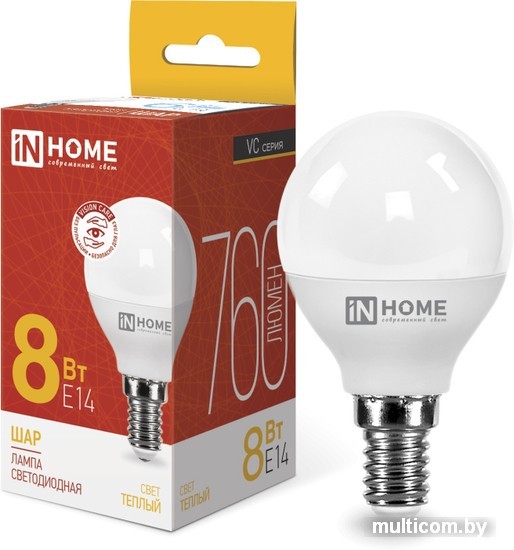 Светодиодная лампочка In Home LED-Шар-VC 8Вт 230В Е14 3000К 760Лм 4690612020549