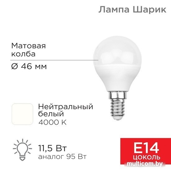 Светодиодная лампочка Rexant Шарик (GL) 11,5Вт E14 1093Лм 4000K нейтральный свет 604-042