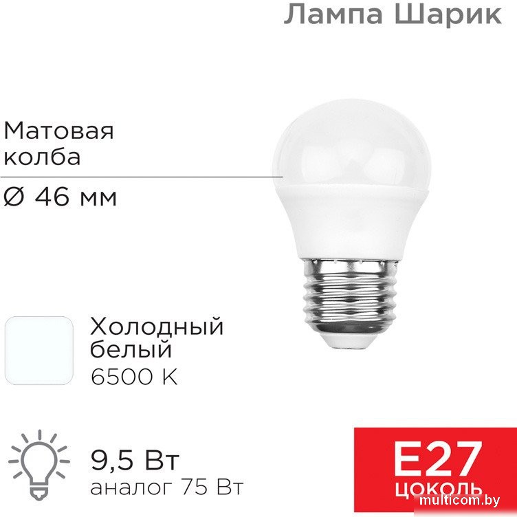 Светодиодная лампочка Rexant Шарик 9.5 Вт E27 6500K 604-208